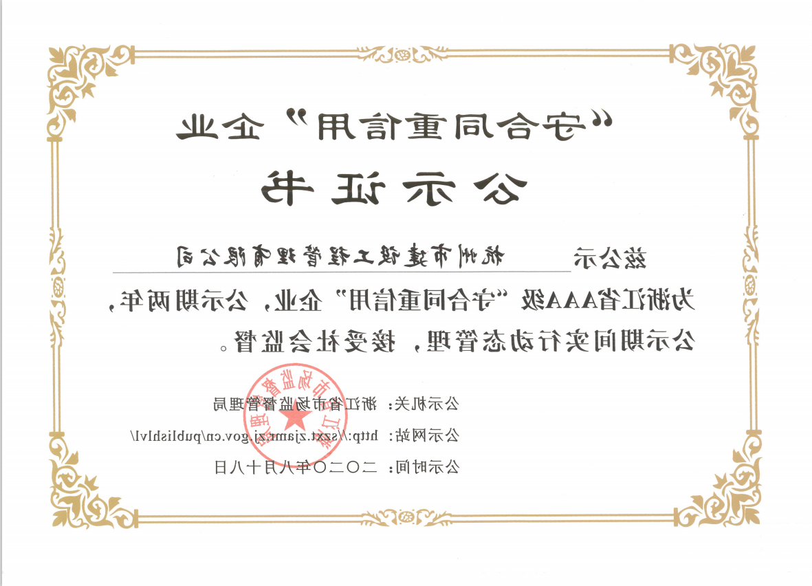 喜报 我公司荣获2020年浙江省AAA级“守合同重信用”公示证书